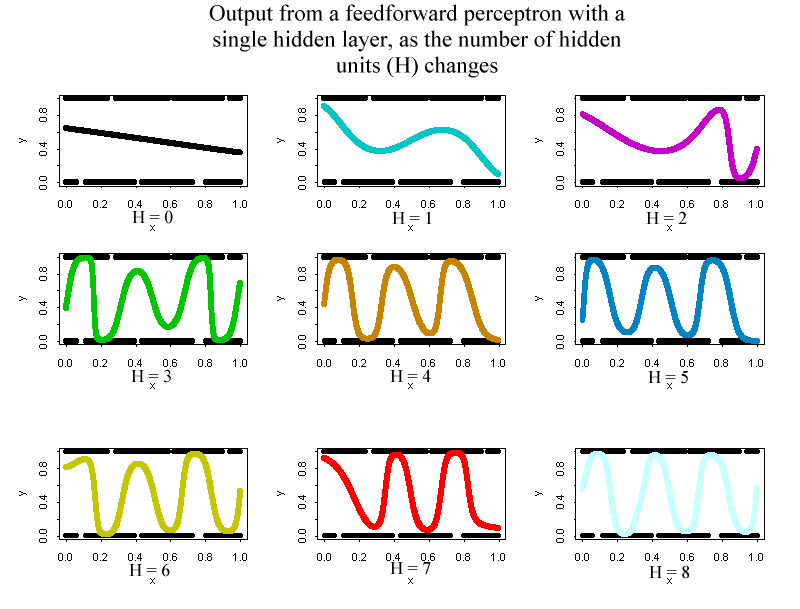 Graph 2. The following graphs illustrate the ability of the neural network to capture non-linearities. The scenario is that there are two groups in the population. The probability of being in group 1 varies with the sin of x. The aim is to capture from the raw 0/1 data how the probability of group membership depends on X. Each graph shows the predicted output from a one hidden layer neural network as the number of units in the hidden layer varies from 0 to 8. Note how the network is able to capture the non-linearity so long as the number of hidden units is large enough. The approximation to the sin curve appears to improve with the number of hidden units.