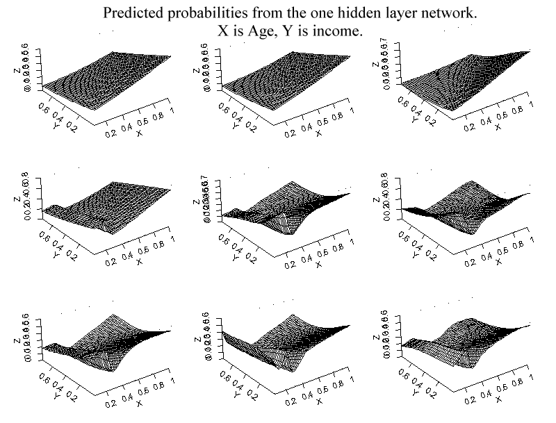 Graph 3. In this graph the predicted response probabilities are calculated for the internet demographics datset, but this time from a set of neural networks in which the number of units in the hidden layer varies between 0 and 8. Notice how the smoothness of the surfaces decreases as the number of units increases. This figure should be contrasted with Graph 1. Graph 3 shows both the value of the network which has the ability to capture non-linearities or "wrinkles" in the suface, and also one of the issues associated with highly non-linear models: which of the wrinkles are real, and which are a result of overfitting? In this particular dataset, a possible explanation for the ridge associated with younger people is the impact of easy access to internet links that undergraduate students enjoy. Validating the network on out of sample data is one way to go about answering the fundamental question concerning the "realness" of the observed non-linearities..