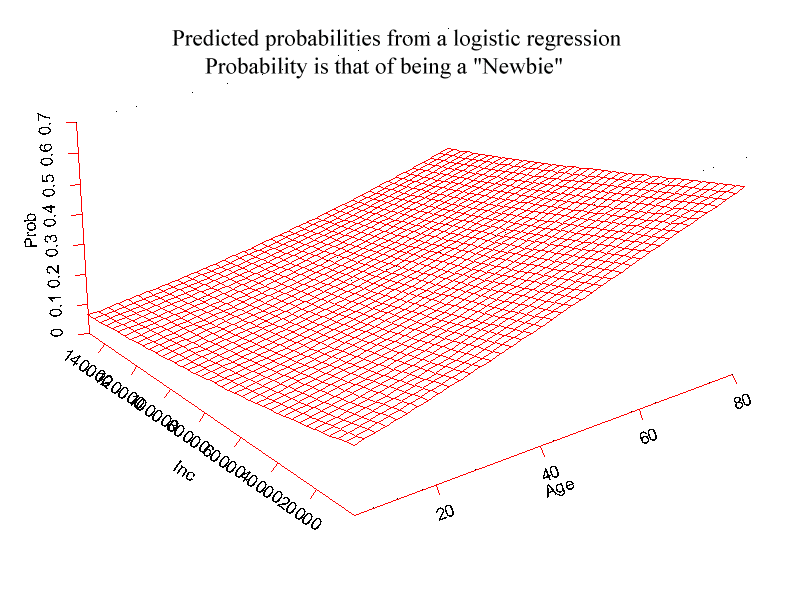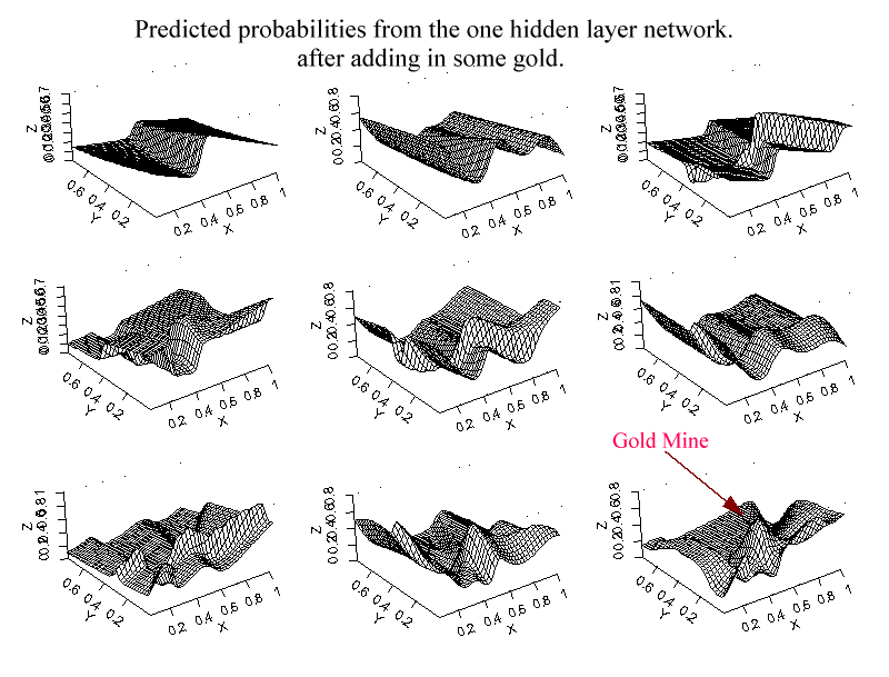 Graph 4. This graph again plots the predicted probabilties from the neural network, but this time after the demographics dataset has been manipulated to include some "gold". In this case people with ages between 35 and 45, and income sbetween 35,000 and 45,000 were recoded as 1's, that is as newbies. This inserts a spike into probability surface. With enough hidden units the network is indeed able to uncover the gold.